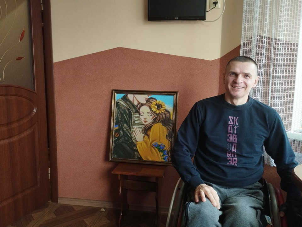 На фото – ветеран російсько-української війни Андрій Стецько. А біля нього – робота його рук.